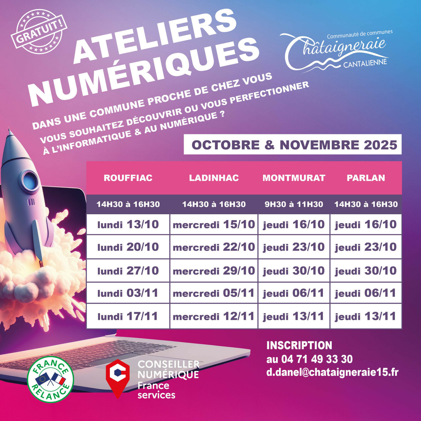 La date des prochains ateliers numériques, ouverts à tous et entièrement gratuits, sont disponibles dans la rubrique Au Quotidien / Châtaigneraie Cantalienne / Ateliers Numériques